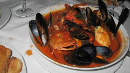 Last night: Il Galeone, in Piazza San Cosimato, just down the hill from us: either take the bus down the S-curves of Via Dandolo, or take the path through the grass to the two twisting staircases.  It’s one of those places that you really can’t judge from the outside.  Does it just look authentic, or is it really good?  I wouldn’t have tried it without the recommendations of numerous friends, who all said to order the fish soup.  OK.  But what do they mean by “mezzo” (half)?  Here’s what: