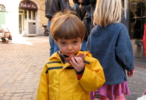 Then we wandered with our fruit-heavy bags back to Sarah’s car, stopping in little shops along the way. One of them was a funky second-hand store, with everything from a vintage Singer sewing machine—from the 1910s—to Pokemon cards. Now, if I had known then what I know now, I would have bought a huge handful of those cards. For the past few days of goodbyes Jack has been cathecting all of his mixed emotions onto his carte di Pokemon. I buy a pack for him (and they’re exploitatively expensive!) and he gives them all away as regali. Or his more cunning friends convince him to trade 4 for 1. I tell him I won’t buy him anymore, and he cries and says he doesn’t want to go to school or see his friends again. I say, “I know you’re sad that we’re leaving. Let’s talk about what you like about Rome” and he’ll say, “I like the buses and the carte di Pokemon.” It’s been a sad time for him, because he’s had such a wonderful year. He learned Italian and finally feels comfortable with his Italian friends and teachers. He loves his school. He loves life here at the Academy where there are always friends available right next door. So he channels his emotions into the things he can grasp at and consume until we go away (friends are too complicated for these operations): Gormiti (little Italian elemental action figures), Pokemon cards (which, he doesn’t know, are everywhere), and ciambellini (the mini doughnuts they make at the Kosher cafe we stop in almost every morning before school). We all do it. I’m drinking more coffee because I know I won’t taste coffee like this in the New World. I’m putting one more slice of mozzarella on my plate because it might be my last for years. I’m getting a cup of pistachio gelato even if Jack doesn’t want any. We’re trying to squeeze in one more coffee-date, playdate, late-night conversation with the wonderful friends we’ve made here. And I’m trying to drink in the views and sounds of Rome so that I won’t forget any of it, so that it won’t become muted and hazy when we get back to “real life.”